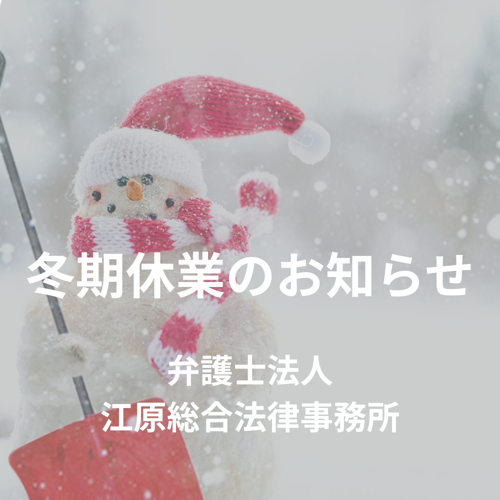 お知らせ 2025.11.20 冬期休業のお知らせ 誠に勝手ながら、下記の期間につきまして冬期休業とさせていただきます。 期間中はご不便ご迷惑をおかけ致しますが、 何卒ご了承くださいますようお願い申し上げます。 冬期休業期間:2025年12月27日(土)~2026年1月4日(日) ※12月26(金)は都合により12時までの営業となります。 1月5日(月)より通常通り営業いたします。 Read more お知らせ 2025.09.08 弁護士費用改定のお知らせ 江原総合法律事務所では、皆さまに安心して法的サービスをご利用いただけるよう、法的知見の研鑽および業務の最適化に努めてまいりましたが、昨今の物価高騰、社会情勢を踏まえ、この度、弁護士費用の一部を改定させていただく運びとなりました。 【改定適用日】 2025年10月1日以降に正式にご依頼いただいた案件(契約成立分)から、新料金を適用いたします。 【対象となる業… Read more お知らせ 2025.07.01 夏期休業のお知らせ 誠に勝手ながら、下記の期間につきまして夏期休業とさせていただきます。 期間中はご不便ご迷惑をおかけ致しますが、 何卒ご了承くださいますようお願い申し上げます。 夏期休業期間:2025年8月10日(日)~2025年8月17日(日) ※8月7日(木)は都合により12時までの営業となります。 8月9日(土)は通常通り営業いたします。 Read more お知らせ 2025.04.07 川西輝枝弁護士加入のお知らせ 令和7年4月1日、川西輝枝弁護士が入所いたしました。 Read more お知らせ 2025.03.31 ゴールデンウィークの休業日のお知らせ 誠に勝手ながら、下記の期間につきましてGW休業とさせていただきます。 期間中はご不便ご迷惑をおかけ致しますが、何卒ご了承くださいますよう お願い申し上げます。 GW中の休業期間: 2025年5月3日(土・祝)~2025年5月6日(火・振替休日) Read more