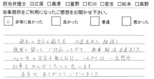 相談させていただくことになりました。法律に無知である私にも黒澤先生はわかりやすく説明してくださり解決への道を示していただき不安な気持ちがとても楽になりました。そして何より、黒澤先生のおかげて問題を解決できたことを心から感謝申し上げます。