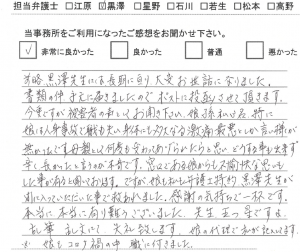 前略 黒澤先生には長期にわたり大変お世話になりました。今更ですが被害者の声としてお聞きください。娘孫私3名、特に娘は人身事故で職も失い、身体にも多大なる激痛。最悪としか言い様が無かったです。母親として何度も変わってあげられたらと思い、どうすることもできず、辛く、長かったというのが本音です。窓口である